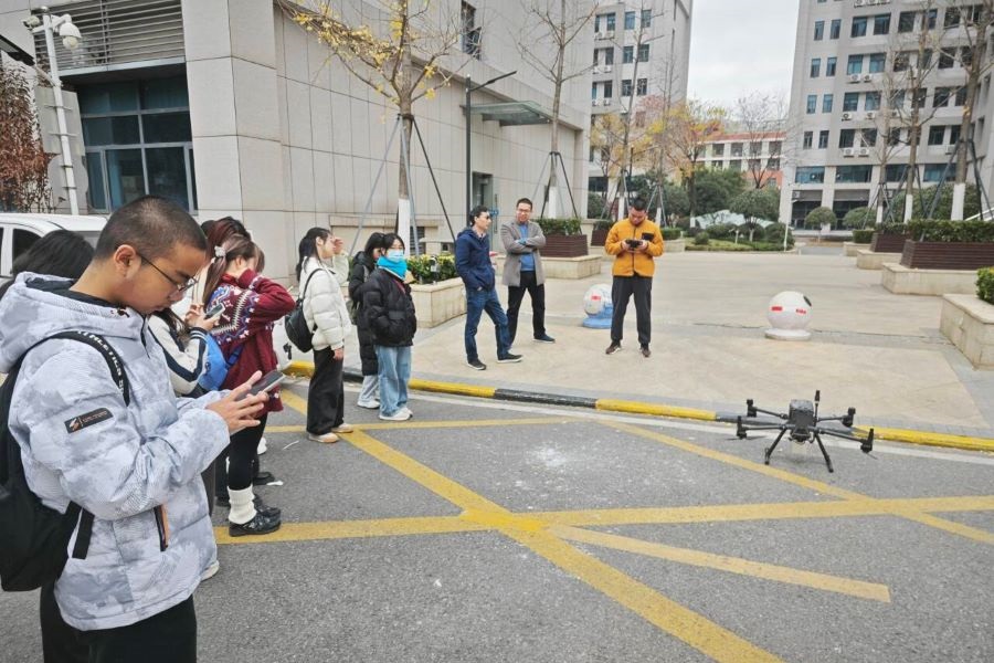 在武漢際上導航科技有限公司,公司副總經(jīng)理劉杰先生給GIS協(xié)會的同學們介紹了該公司無人機激光雷達、手持激光雷達的研發(fā)與市場應用情況。在講解完理論之后,公司技術骨干和同學們來到公司樓下,以天頤科技園為地理空間數(shù)據(jù)的采集對象,現(xiàn)場演示了最新研發(fā)的專業(yè)設備采集地理空間數(shù)據(jù)的方法與過程。在這個過程中,學生學習了解了無人機的飛控知識與激光雷達的優(yōu)勢。