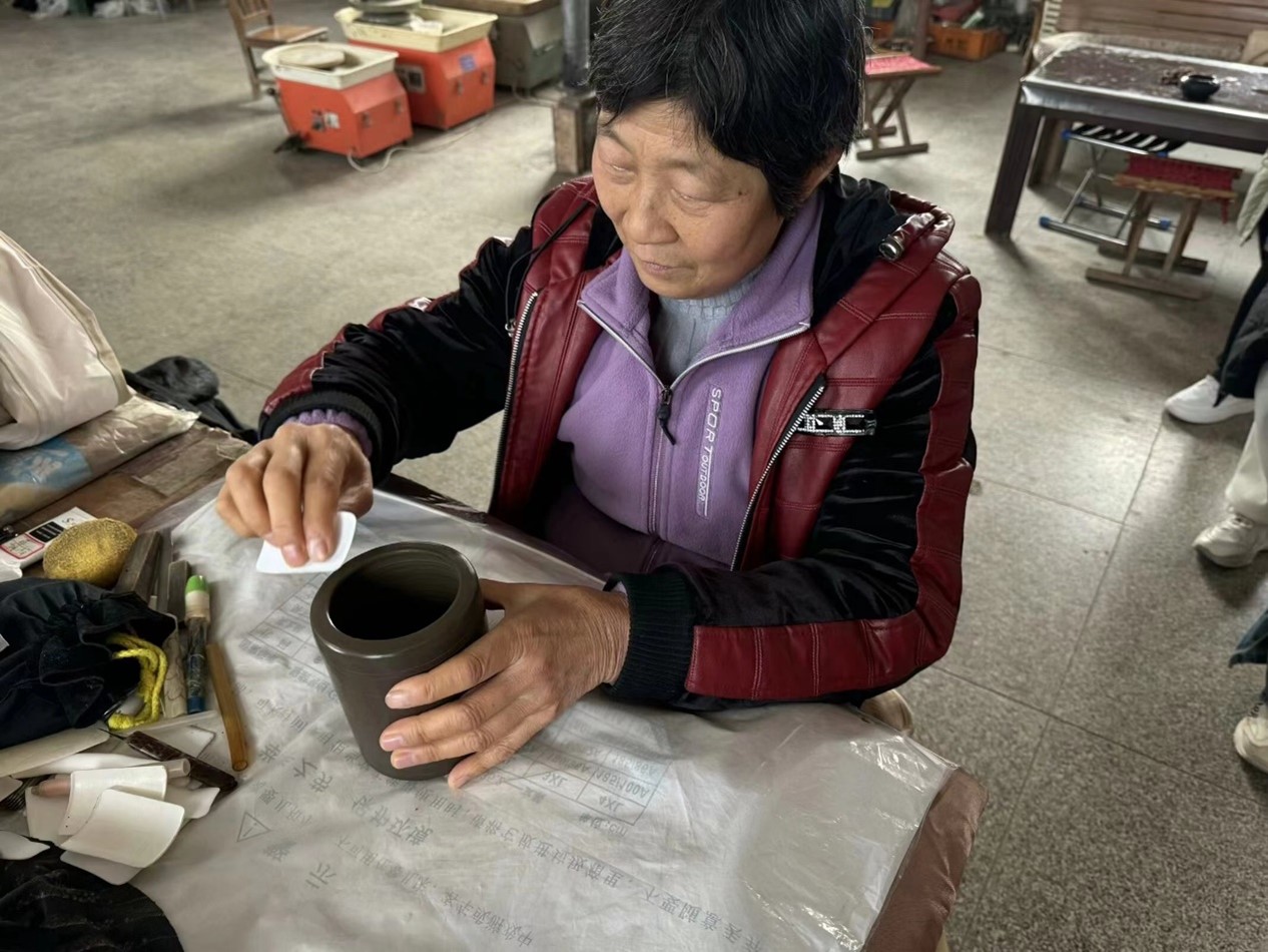圖為黑陶匠人用專業(yè)工具對(duì)晾曬好的黑陶進(jìn)行拋光。中國青年網(wǎng)通訊員 溫沅潤 供圖