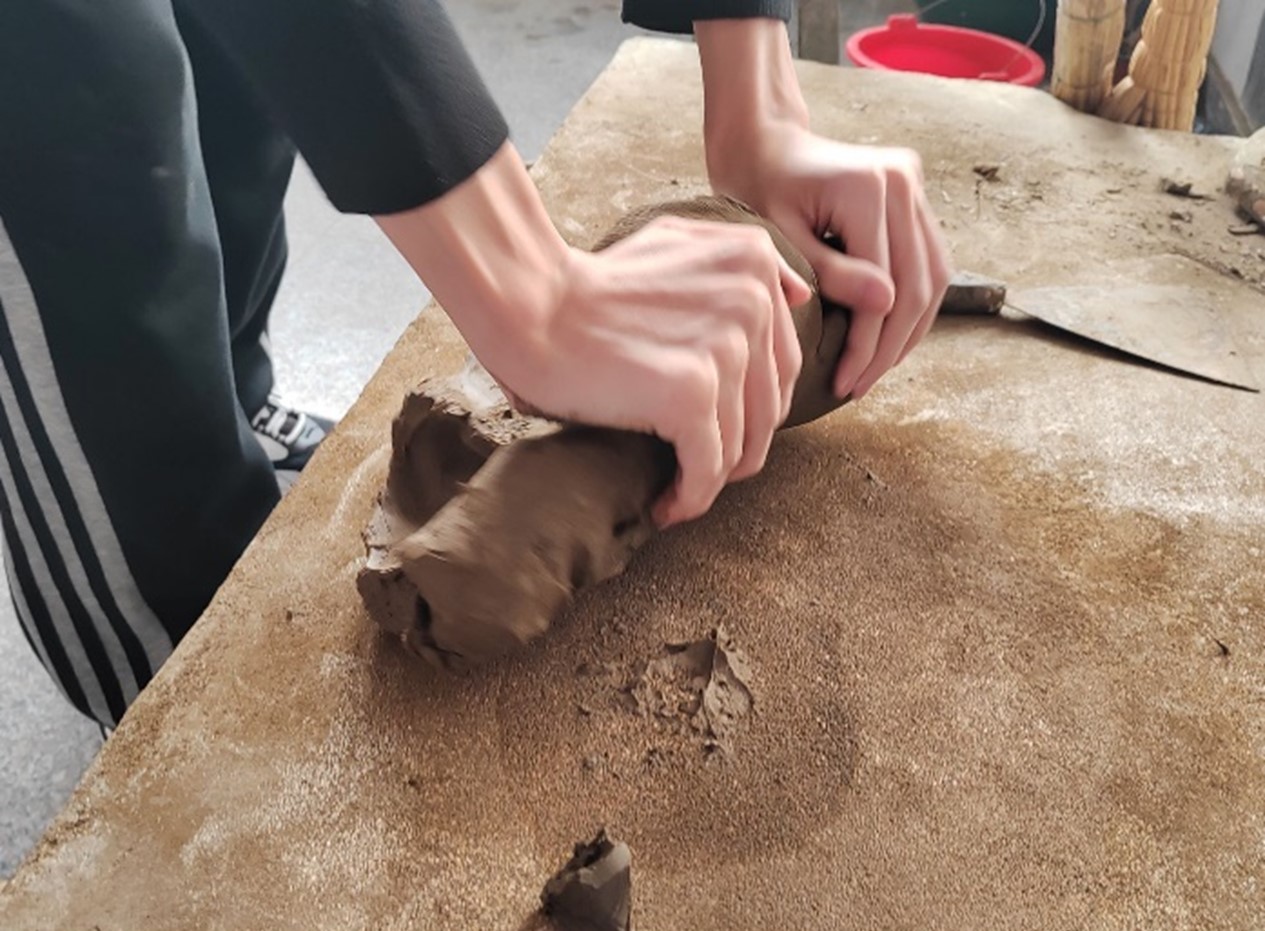 圖為實(shí)踐隊(duì)員卷泥的過程,實(shí)踐隊(duì)員通過實(shí)踐操作了解制作過程。中國青年網(wǎng)通訊員 岳明坤 供圖
