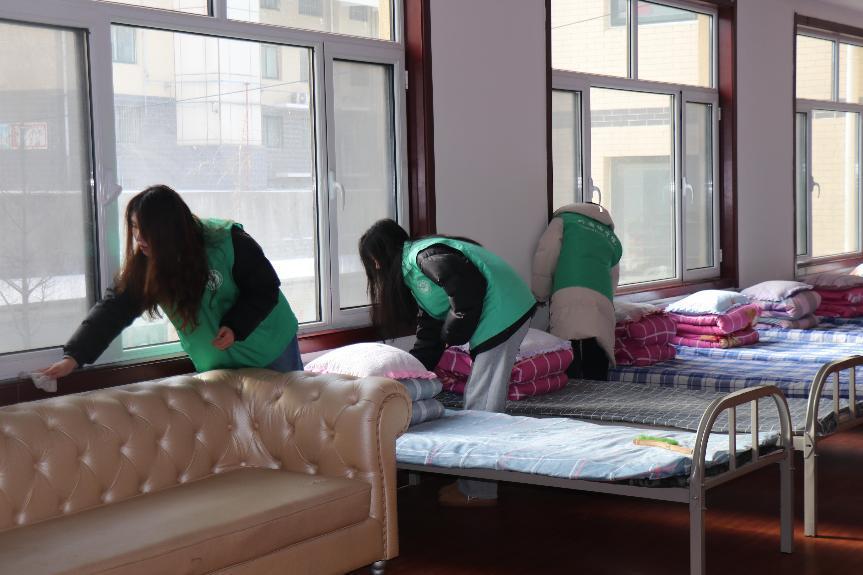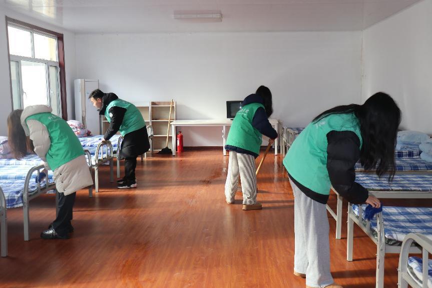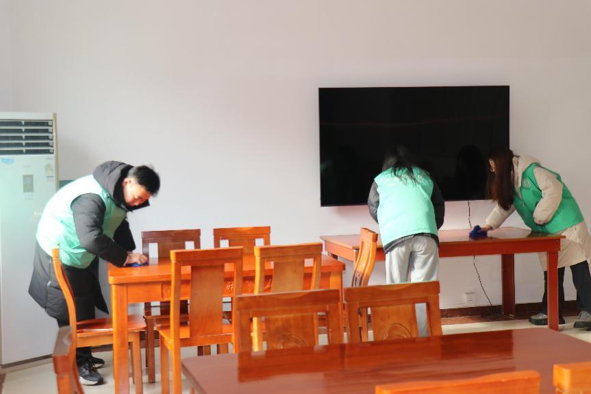 實踐隊員前往蘆南村日間照料中心進行志愿服務活動。活動中,實踐隊員手拿拖把、抹布等工具,對房間內的衛生進行打掃,擦拭桌椅、清掃走廊地面,確保老人們活動空間整潔舒適。