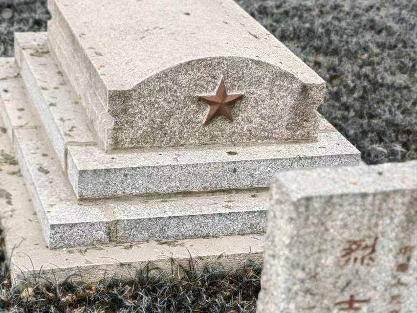 繞過烈士英名錄,映入眼簾的是整整齊齊的墓地,每一塊墓碑下都長眠著一個不朽的靈魂。我慢慢走在小道上,一點一點默念他們的英名。有些人的遺體葬在這里,更多的人只留給下一些遺物,他們的身軀隨著風(fēng)散落在神州大地,庇佑著生前護衛(wèi)過的地方。生命雖然短暫,卻閃耀著絢麗的光芒。我總覺得那方墳?zāi)固。〉匠休d不起一個人的歲月,碑文上一個名字就能概況他們的一生;那點土地又太大,大到我走了好久,直到眼睛被淚水模糊,也沒能走到盡頭,四四方方的石碑容納下他們所有的期許和愿望,直到今天依舊閃著光。
