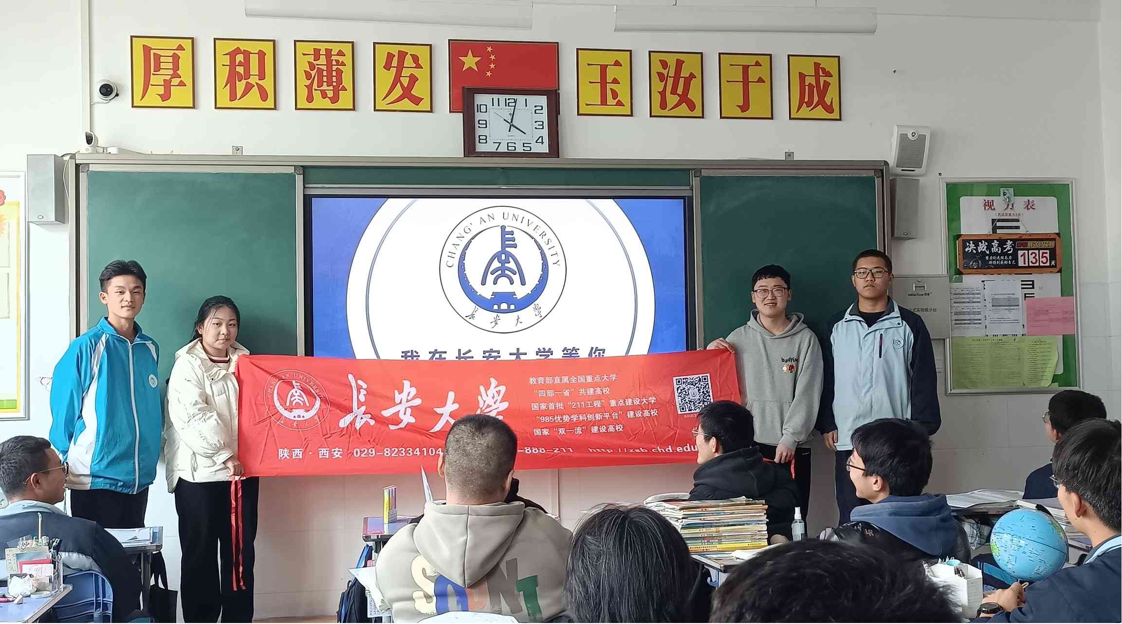 桃李不言,下自成蹊;踔厲奮發(fā),逐夢(mèng)前行。為進(jìn)一步加強(qiáng)長(zhǎng)安大學(xué)與優(yōu)秀生源基地高中的聯(lián)系,擴(kuò)大學(xué)校影響力,為學(xué)校招納更多優(yōu)秀人才,為莘莘學(xué)子在高三的生活中增添一份熱情。長(zhǎng)安大學(xué)“優(yōu)秀學(xué)子回母校”甘肅二隊(duì)張?chǎng)巍⒛瞾啿⑧嵵堑热擞?024年1月24日于會(huì)寧二中開(kāi)展長(zhǎng)安大學(xué)招生宣講。會(huì)寧二中高三五班全體同學(xué)、班主任老師參與宣講。