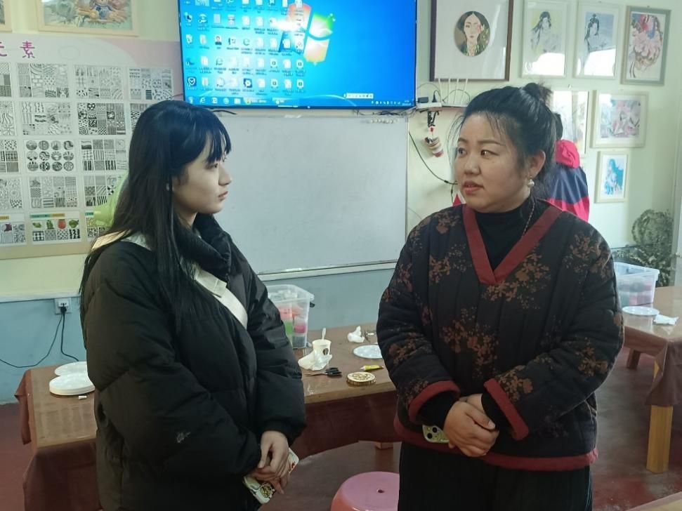 在學生進行創作的間隙中,實踐隊員對楊云老師進行了采訪,楊老師來自于藝術世家,收到家中手工藝人的影響選擇繼續傳承這項技藝,作為第五代傳承人,楊老師致力于作品設計和創作的同時,也通過藝術學校的方式將這項技藝傳遞給更多人,不僅讓孩子們來到藝術學校學習一門小技藝,更主動去到各個學校進行教師培訓和非遺進校園和進社區活動。在老師的學生中,實踐隊員發現了兩位特殊人群的孩子,楊老師說,即使他們表達有困難,亦或帶著耳蝸,他們仍表現地更加出色和更具專注力,深深地詮釋了“上帝為他們關閉了一扇門,就會為他開啟另一扇窗”。