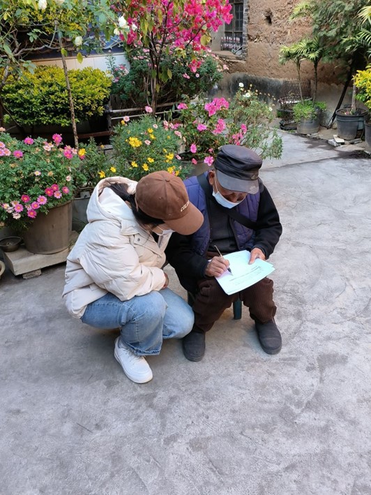 圖為實踐隊員隨機發放調查問卷供村民填寫,通過調查問卷了解農戶的真實需求,為更好明確新型職業農民研學方向提供有力的數據支持。