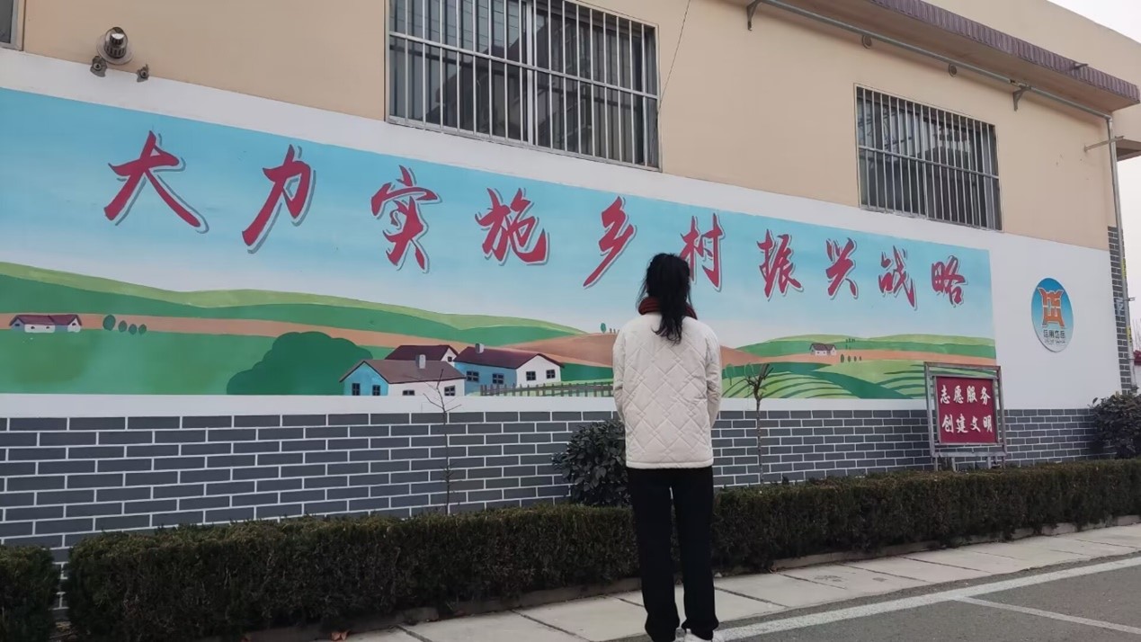 圖為實踐隊員在觀賞小王村內“大力實施鄉村振興戰略”的宣傳畫,感受小王村對人才回流的重視和大力實現鄉村振興戰略的決心。