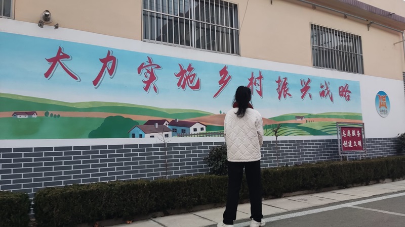 圖為社會實踐隊員觀賞田單村村內“大力實施鄉村振興戰略”宣傳畫報,感受當地對于鄉村農業現代化發展的重視。