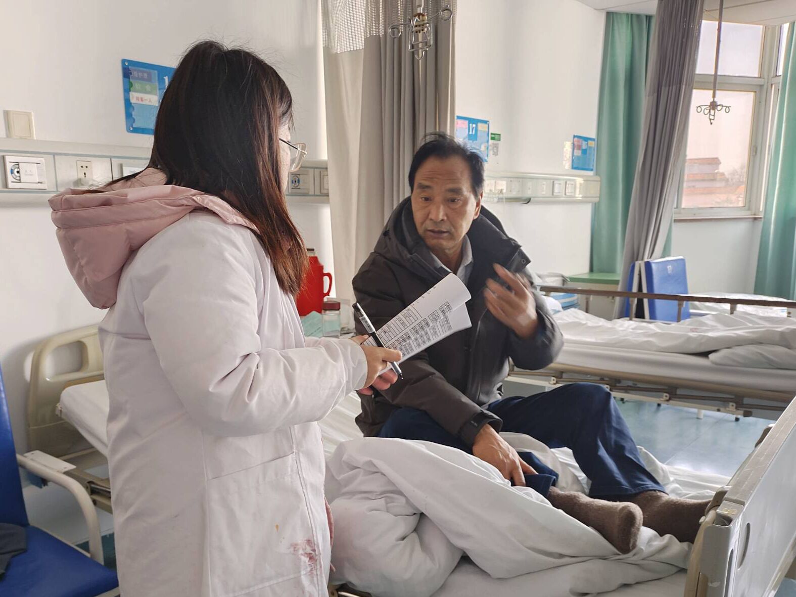 1月15號上午十點,皖南醫學院實踐團的同學們懷著嚴謹認真的心情來到弋磯山醫院住院部。在負責人的帶領下,各自去往不同的住院病區。此次調查問卷的對象主要是患有慢性疾病的人群,包括但不限于高血壓、糖尿病、心血管疾病等。當乘上電梯來到病房時,起初,隊伍里有的隊員因為不善言辭,面對患者和患者家屬時還有些緊張和擔心,不過在患者的熱情支持和配合下,彼此間的交流越發順暢。在與患者的交談中,同學們仔細研究問卷調查,耐心詢問并收集患者關于疾病管理、生活習慣、健康認知等方面的信息。