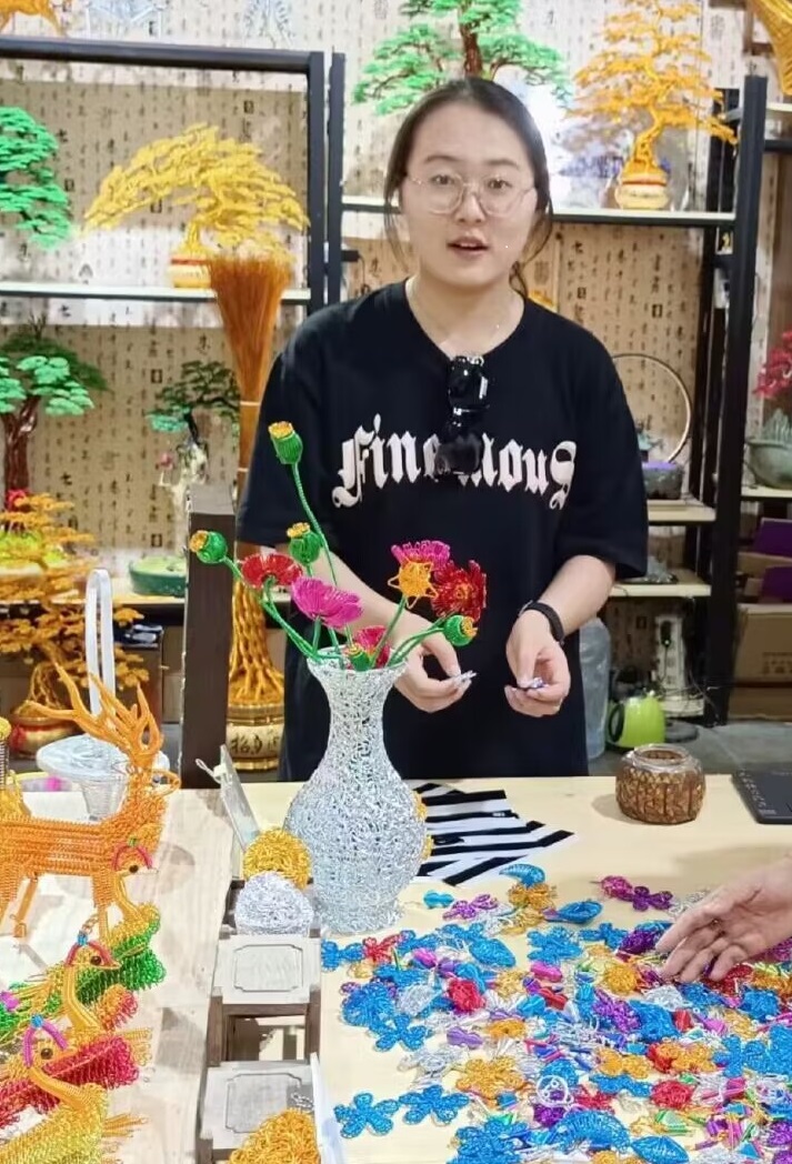 為了更系統、直觀的了解鋁藝的發展歷程,工作人員向實踐隊員展示了近幾年新融入的元素與形象。這里有西方文化中的變形金剛、蜘蛛俠,還有現代中國流行形象“魔童”哪吒。不僅如此,店長還展示了其傳播途徑的創新,這些工藝人給實踐隊員展示直播介紹鋁藝非文化遺產。實踐隊員參與利用短視頻宣傳藝術品。據店員介紹,近幾年鋁藝在傳承與創新方面取得了顯著的成果。店長介紹道,為了保證鋁藝技藝得以傳承,各地文化藝術機構和職業學校開展了相關的教育和培訓課程,培養新一代的鋁藝工作者。
