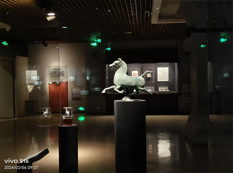 在眾多精美的展品中,成員們印象最深刻的無疑是銅奔馬,成員們通過講解員了解到銅奔馬,又名馬踏飛燕、馬超龍雀等,為東漢青銅器,國寶級文物,1969年10月出土于甘肅省武威市雷臺漢墓,現藏于甘肅省博物館,為甘肅省博物館鎮館之寶。銅奔馬通高34.5厘米,長45厘米,寬13.1厘米,重7.3千克,造型矯健精美,作昂首嘶鳴,疾足奔馳狀,顯示了一種勇往直前的豪情壯志,是中華民族偉大氣質的象征。奔馬三足騰空、一足超掠飛鳥的瞬間,飛鳥回首驚顧,更增強奔馬急速向前的動勢,全身的著力點集注于超越飛鳥的一足之上,準確地掌握了力學的平衡原理,具有卓越的工藝技術水平。