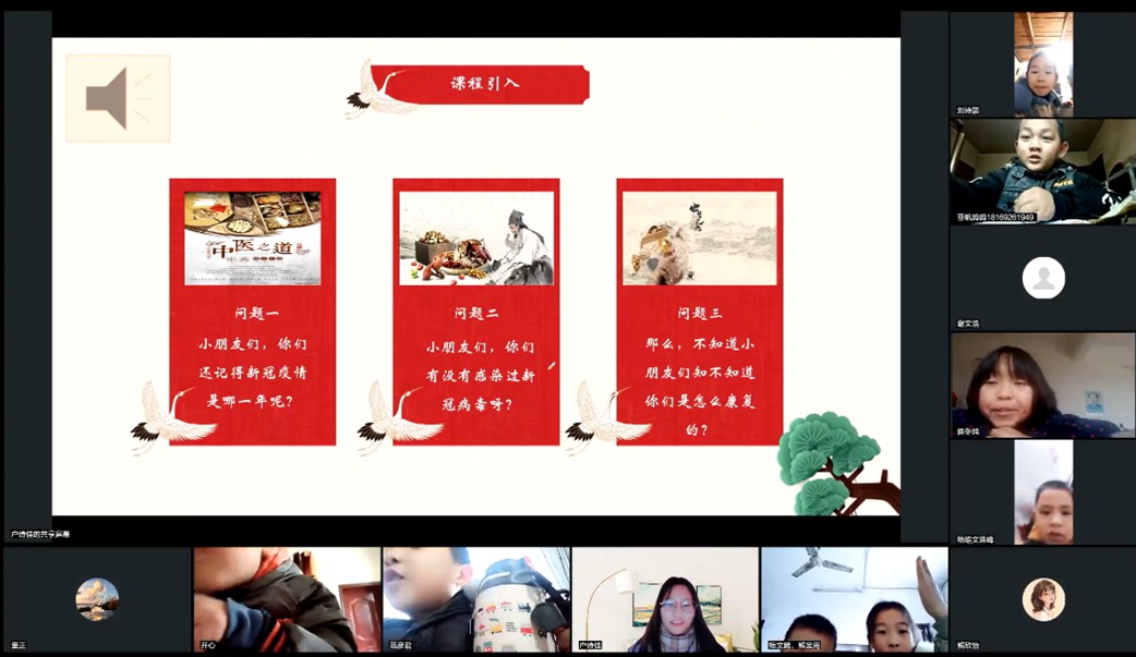 “它是黑乎乎的,不好聞。”“它是苦的,但是特別有效。”這是志愿者老師提問小朋友們對中醫藥的了解時小朋友的回答。課程以新冠疫情為切點引入課程,在抗擊新冠肺炎疫情這場大考中,我國發揮中醫藥獨特優勢,中西醫結合、中西藥并用,不僅交出了優秀答卷,也為醫療衛生事業的發展提供了寶貴經驗。