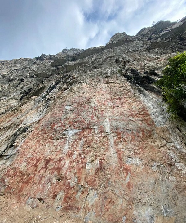 探索隊的調研第一站是花山巖畫。寧明縣花山巖畫實現廣西世界文化遺產和中國巖畫類世界遺產零的突破。通過采訪巖畫保護工作人得知,巖畫所反映的具體內容當前依舊是一個千古之謎。看著巖壁上醒目而鮮活的符號,團隊成員深深被古人的智慧和勇氣所震撼。這鮮活的壁畫不僅體現了古人的智慧,更是壯族先民駱越人留給后人的出色藝術作品。隨后,團隊成員前往駱越文化宮進行調研。寧明是駱越民族的根祖地,駱越文化宮是展示駱越文化、紀念駱越王的圣地。漫步在這座仿古建筑中,團隊成員不僅能夠感受到古建筑的風韻,更能領略寧明這座壯鄉的獨特民族風情。