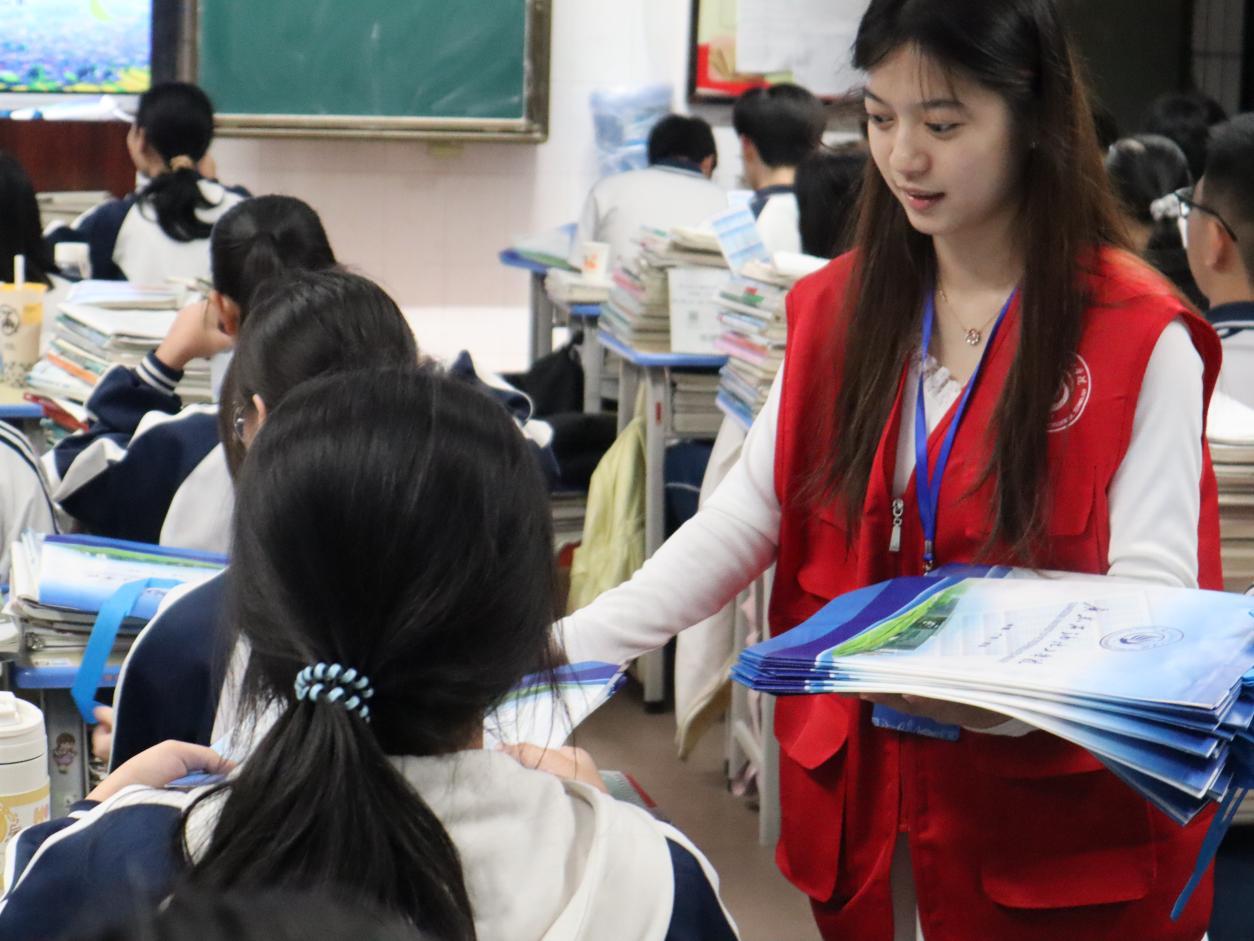 在學校老師的帶領之下,我們在自習課時間走進了一中學校的班級里面開展了宣傳活動。隊員們分工明確,積極配合,首先我們給同學們發放學校宣傳冊和宣傳袋,由團隊宣講人帶領同學們一起熟悉手冊內容。
