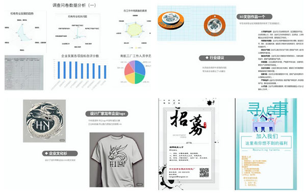 總結創新階段,隊員們一起整理、分析調查問卷數據,開展頭腦風暴嘗試對企業發展面臨的困難提出個人觀點。針對調研實踐中發現的企業人才年齡斷層、缺乏數控人才的痛點問題,同學們利用所學,為企業設計了龍年招聘LOGO及海報、企業文化衫、企業文創產品等,幫助企業提高招聘吸引力,受到企業好評。