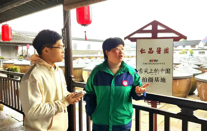 2月2日,實踐隊隊員在安昌古鎮采訪仁昌醬園有限公司董事長俞彩玉女士。劉驍航 攝