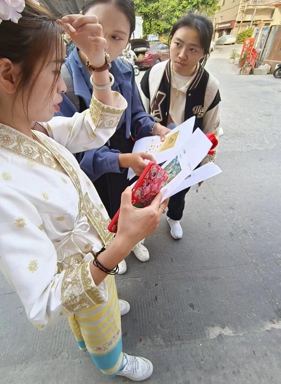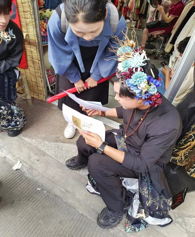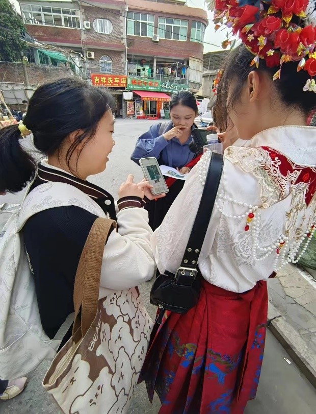 圖 6:與當(dāng)?shù)睾⑼涣?br /> 這些旅客來(lái)自世界各地,他們對(duì)蟳埔簪花的獨(dú)特魅力和文化內(nèi)涵贊不絕口,同時(shí)也提出了一些寶貴的建議和意見(jiàn)。比如,有旅客認(rèn)為,現(xiàn)有的文創(chuàng)產(chǎn)品可以更多地融入一些現(xiàn)代化的設(shè)計(jì)元素,以吸引更多年輕消費(fèi)者的目光;也有旅客對(duì)我們的文創(chuàng)產(chǎn)品本身提供了一些改進(jìn)意見(jiàn)比如東西雙塔耳墜整體可以設(shè)計(jì)的更加細(xì)長(zhǎng),不會(huì)顯得佩戴者臉大等問(wèn)題。以及對(duì)于簪花圍花簽的建議是可以采用在花簽上采用多樣化字體,為文創(chuàng)產(chǎn)品增添一筆文化底蘊(yùn)。還有旅客建議,可以開(kāi)發(fā)一些與蟳埔簪花相關(guān)的互動(dòng)體驗(yàn)項(xiàng)目,讓游客在親身參與中更深入地感受傳統(tǒng)文化的魅力。文創(chuàng)產(chǎn)品中蟳蜅女手辦畫(huà)框得到了大眾的喜愛(ài),幾乎每位旅客都對(duì)這款文創(chuàng)產(chǎn)品贊不絕口,初步的蟳蜅女畫(huà)框平面設(shè)計(jì)圖片也可以應(yīng)用在多個(gè)產(chǎn)品中比如在已有的文創(chuàng)產(chǎn)品冰箱貼上、扇子、筆記本封面等等。從上海過(guò)來(lái)旅游的兩位女生表示,如果蟳埔有售賣冰箱貼或者畫(huà)扇一類的文創(chuàng)產(chǎn)品,會(huì)考慮走的時(shí)候買(mǎi)上當(dāng)紀(jì)念;寧德來(lái)的兩位男生表示可以把粘土相框做的更貼合泉州本地特色,讓人一眼就能領(lǐng)略到泉州的美和強(qiáng)烈的文化底蘊(yùn);當(dāng)?shù)氐男W(xué)生表示,如果可以融入一些卡通元素會(huì)更吸引眼球……