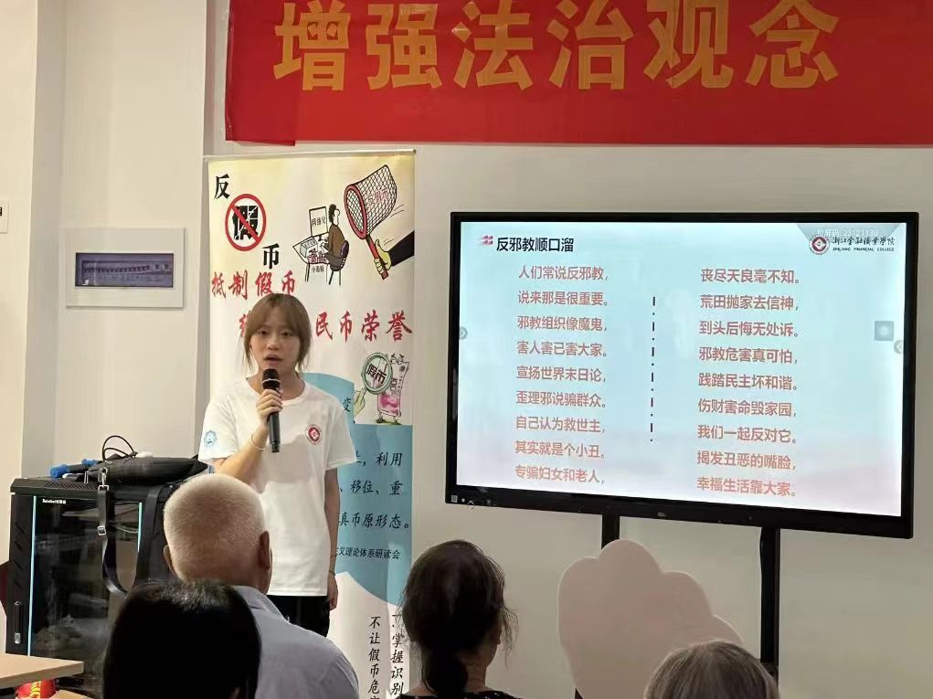 為增加法治教育,擴大反邪教意識,7月1日上午,浙江金融職業學院馬克思主義學院中國特色社會主義理論體系研讀會、反邪教協會暑期實踐團于桐廬莪山畬族鄉老年學校開展了反邪教、反假幣、反詐騙的“三反”宣傳教育活動。