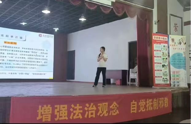 為貢獻青年擔當,書寫青年擔當,2024年7月2日,浙江金融職業學院馬克思主義學院中國特色社會主義理論體系研讀會、反邪教協會“金馬先聲”理論宣講團,于桐廬莪山畬族鄉龍峰村文化禮堂開展了反邪教、反假幣、反詐騙的“三反”宣講活動。