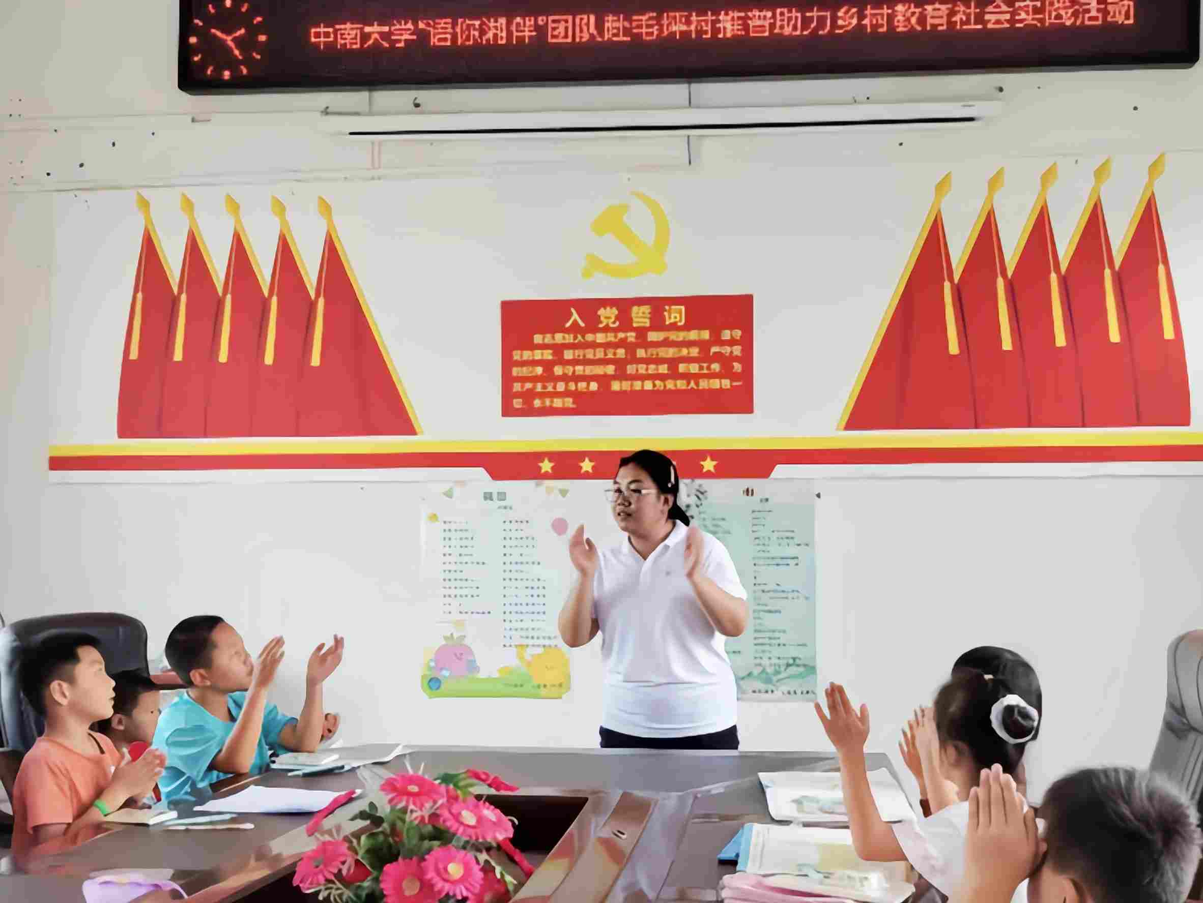 七月盛夏,熱情如織。為加大農村地區語言文字推廣力度,提高鄉村小學生對普通話的認知程度,激發其學習普通話的興趣,中南大學人文學院“語你湘伴”推普志愿服務團隊于7月3日上午來到湖南省永州市零陵區郵亭圩鎮毛坪村,開展推普課程活動。