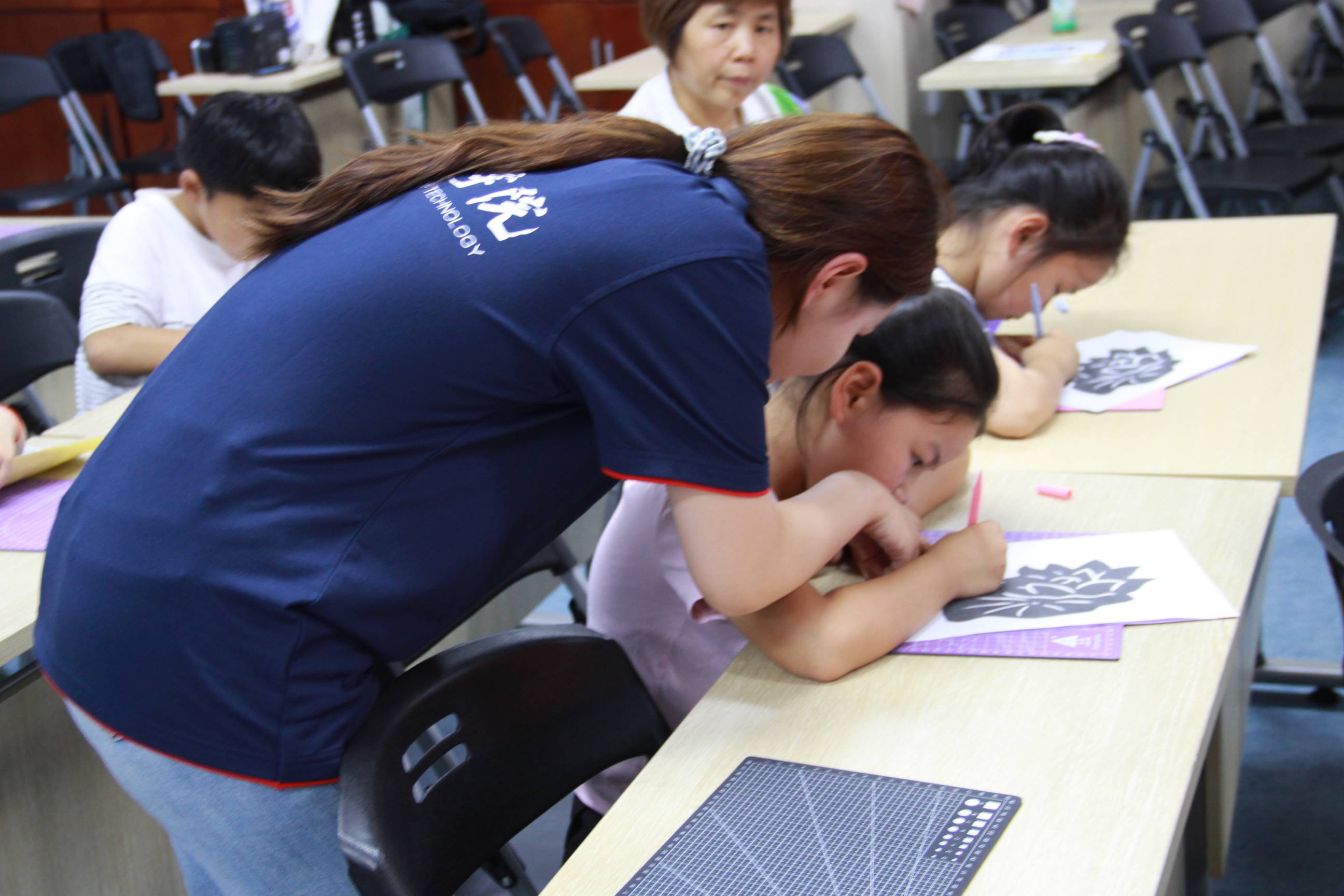 圖為新晨社區(qū)活動(dòng),團(tuán)隊(duì)成員協(xié)助小朋友刻紙。多彩大學(xué)生網(wǎng)通訊員 王宇杰 攝
