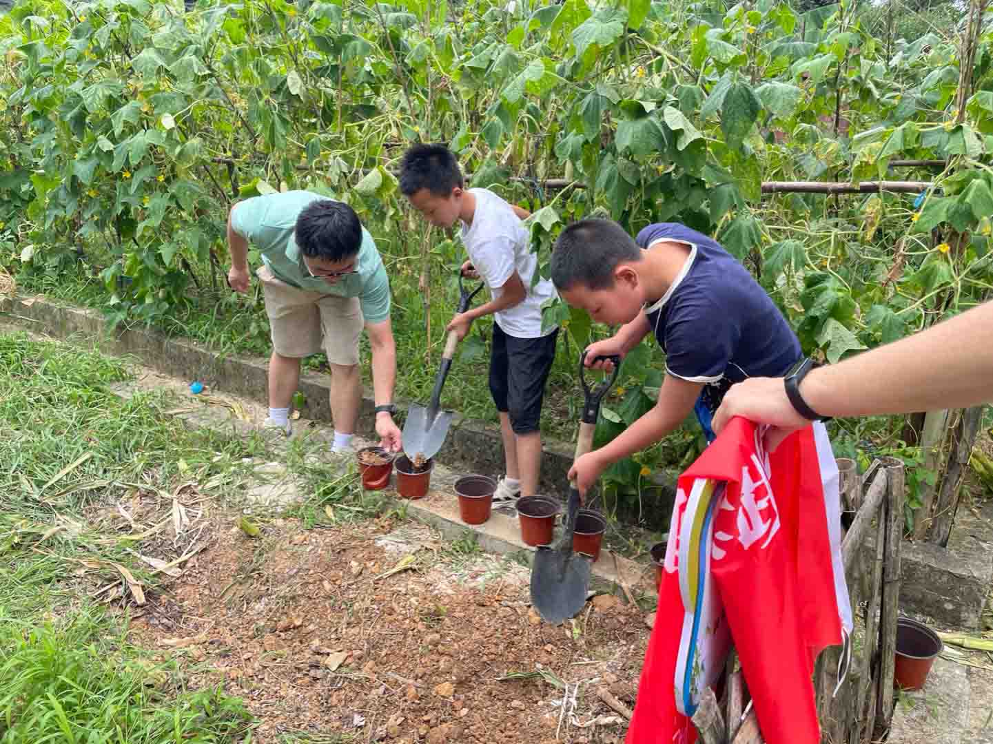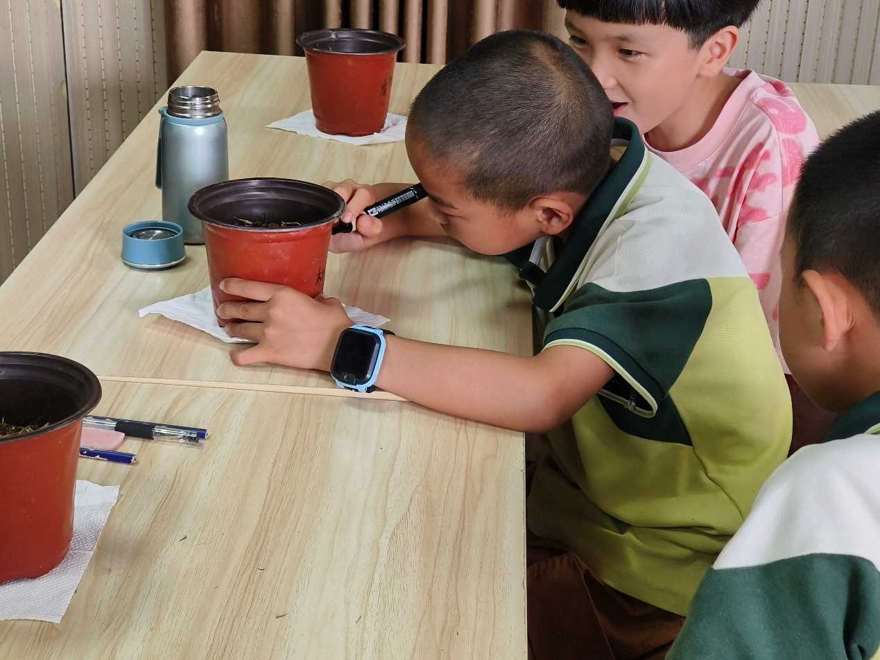 實踐團成員將全校各年級留守兒童分為五個小組,分組開展“識竹米,播竹種”活動,帶領孩子們依次前往學校外圍菜園空地現場鏟土,放入各自分配的花盆中,現場秩序井然,為接下來的課程和活動有序開展做了一個好的鋪墊。