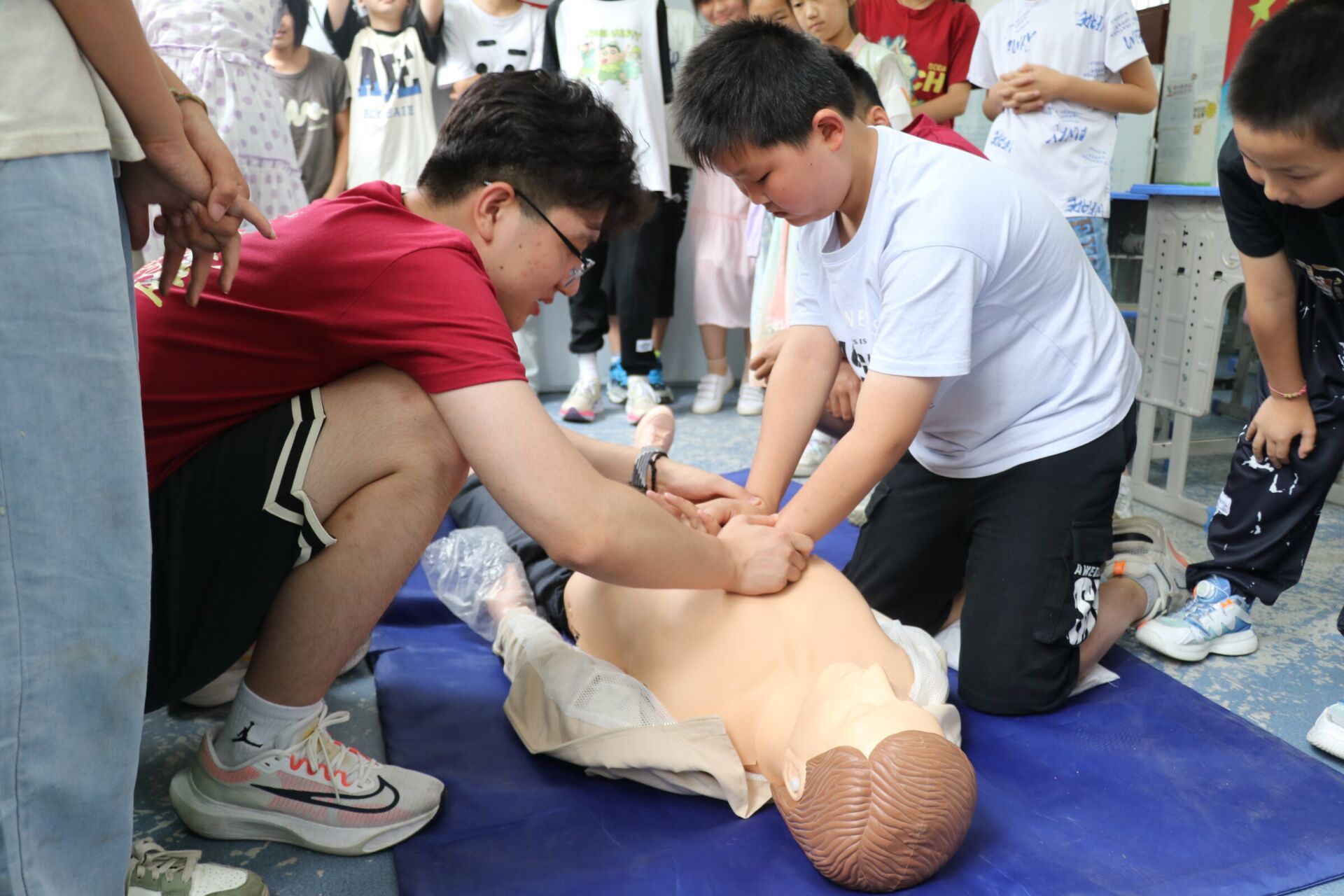 為了讓孩子們更好地掌握自救技能,實(shí)踐團(tuán)成員們精心準(zhǔn)備了假人進(jìn)行實(shí)戰(zhàn)演練。這一刻,教室仿佛化身為一個(gè)小小的戰(zhàn)場(chǎng),每一個(gè)孩子都是勇敢的戰(zhàn)士,他們按照教練的指導(dǎo)一步步操作著每一個(gè)動(dòng)作。雖然過(guò)程中不乏緊張與失誤,但那份對(duì)生命的敬畏和對(duì)安全的渴望卻愈發(fā)強(qiáng)烈。他們學(xué)會(huì)了在關(guān)鍵時(shí)刻保持冷靜與果敢,用智慧與勇氣為自己爭(zhēng)取生存的機(jī)會(huì)。尤為感人的是,當(dāng)實(shí)踐團(tuán)游泳教練手把手教授孩子們進(jìn)行心肺復(fù)蘇時(shí),那份專注與溫情讓整個(gè)教室都充滿了愛(ài)的力量。孩子們的小手輕輕按壓在模擬人偶的胸膛上,每一次按壓都仿佛是對(duì)生命的呼喚與守護(hù)。這一刻,他們不僅學(xué)會(huì)了自救技能,更體會(huì)到了生命的重量與責(zé)任。