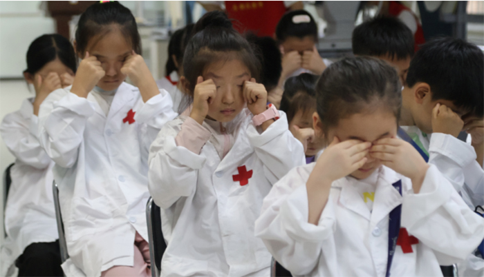 在光明眼科學院,孩子們不僅學習了眼部知識、燙傷及流鼻血的處理方法,親自體驗了眼保健操和視力測量,志愿者以生動鮮活的案例,詳細介紹了近視發生的常見原因,并從用眼習慣、用眼衛生、眼部保健、科學用眼等幾個方面,傳授預防近視的"妙招"。同學們聽得格外認真,會場不時發出笑聲與掌聲。
