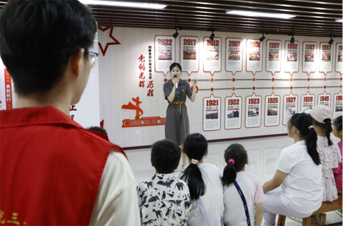 童心永向黨,追夢赤子心 下午,孩子們在志愿者的帶領下走進了新時代學習館。王桃金老師以“童言童語”的形式,向孩子們講述了共產黨的成立歷程和黨的二十大精神,以及航空航天精神和焦裕祿精神等。這不僅增強了孩子們對黨的政治認同、情感認同和實踐認同,也激發了他們為國家復興而努力的熱情。