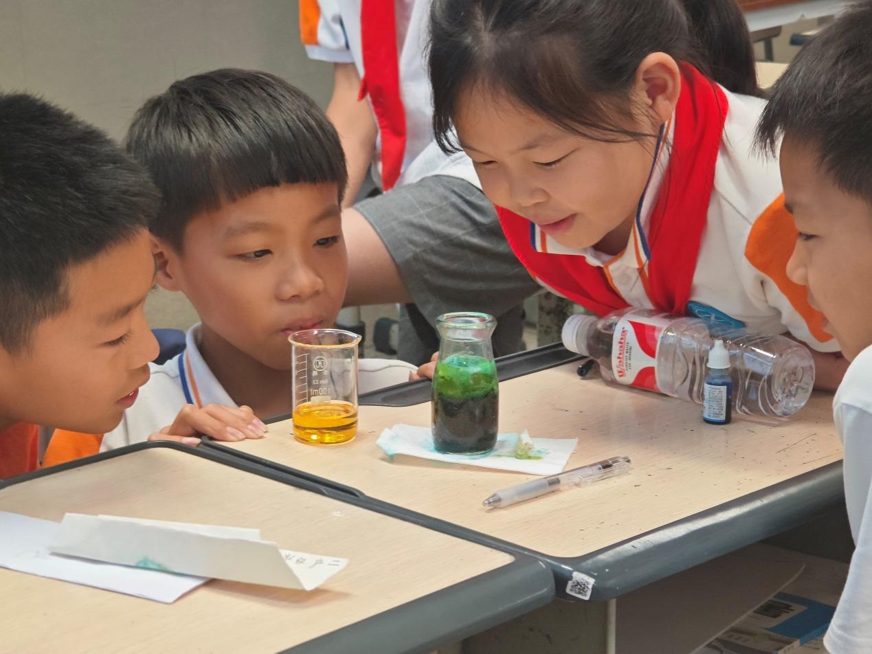 在接下來的實踐過程中,實踐隊成員分工明確,繼續開展教學活動:教學組在課前精心籌備課件,在課堂上認真教學;物資組早已于課前清點并準備好了教學用具與實驗器材,并協助教學組維護課堂紀律;宣傳組負責拍攝記錄,捕捉精彩瞬間,并于課后剪輯視頻、制作微推;編寫組在課上認真記錄,通過撰寫通訊稿與新聞稿來物化實踐成果……也正是在“溫心”暑期社會實踐隊成員們的集體努力下,孩子們從一堂堂課中切實感受到了化學的魅力。特別是在親身參與的實驗課程中,孩子們逐漸培養出對科學的深厚熱愛與不懈探索的精神,他們會將這份寶貴的好奇心與求知欲融入未來的學習與生活中,持續不斷地發掘和創造出更多的奇跡。