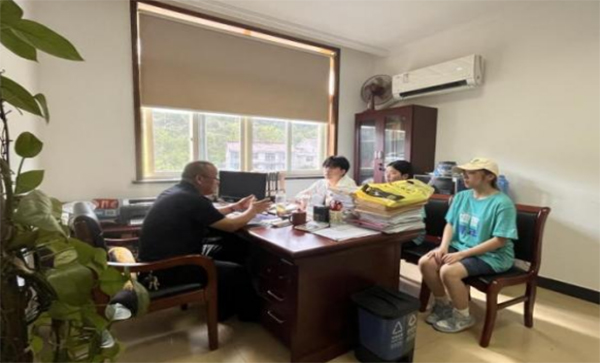 團隊成員與清涼峰鎮政府農林管理主任王一平進行座談交流。王一平介紹道,清涼峰鎮是山核桃的起源地,種植歷史可追溯到明朝。王一平還說道,臨安山核桃產業目前面臨采收工人短缺、農村勞動力外流、采摘風險大、管理成本高等困境。目前,清涼峰鎮積極探索“政府+公司+農戶”的經營模式,推動農業產業規模化、品牌化建設,通過山核桃托管經營、山核桃示范基地建設等方式,多措并舉,帶動村民增收致富。最后他說:“臨安山核桃產業發展任重而道遠,希望廣大青年大學生可以加入鄉村振興的行列!”