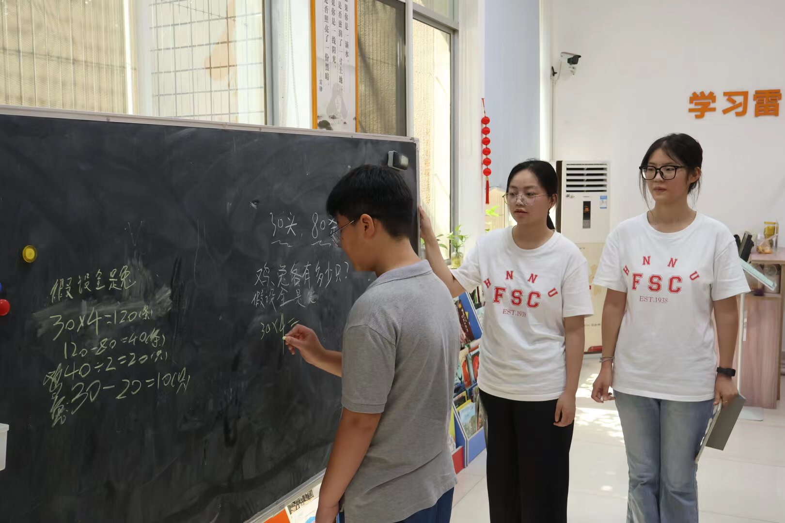 實踐團成員指導小朋友完成雞兔同籠的數(shù)學問題