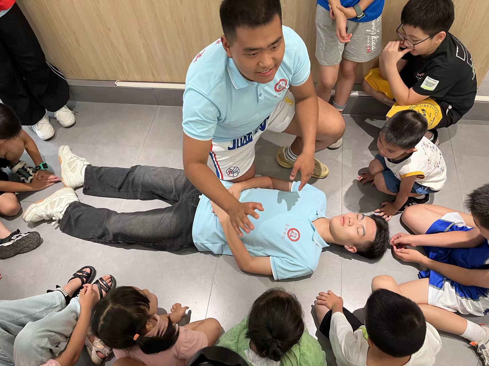 活動現場,實踐隊通過播放動畫視頻的方式,為孩子們講解了心肺復蘇與海姆立克的基本原理、操作步驟及注意事項,并通過真人模擬方式,指導孩子們親身體驗心肺復蘇與海姆立克的正確操作步驟。隨后,實踐隊隊員通過開展生動有趣的火災小實驗向大家講述防火小知識,闡述正確的逃生方法和注意事項。為鞏固今日所學知識,實踐隊組織現場所有小朋友開展一場別開生面的火災逃生練活動,使參與者在親生體驗中深刻理解與掌握了火災逃生的要領。