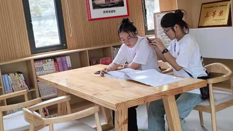 圖為志愿服務隊隊員孫雨婕和張雪琴于杉林灣居委會了解當地特色產業以及歷史背景。 高鑫鑫 攝