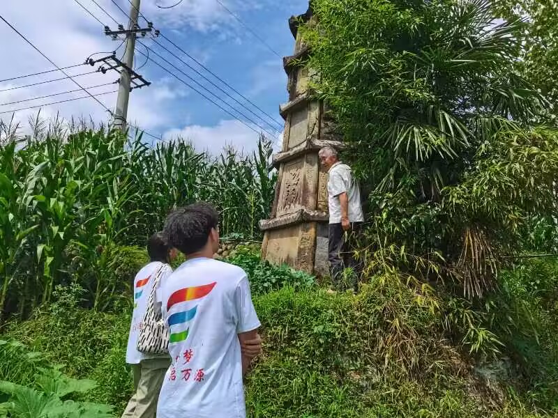 圖為杉林灣村民向志愿服務隊隊員茍祥齊和姜慧講述歷史建筑藏字庫的歷史淵源。 唐嬌月 攝