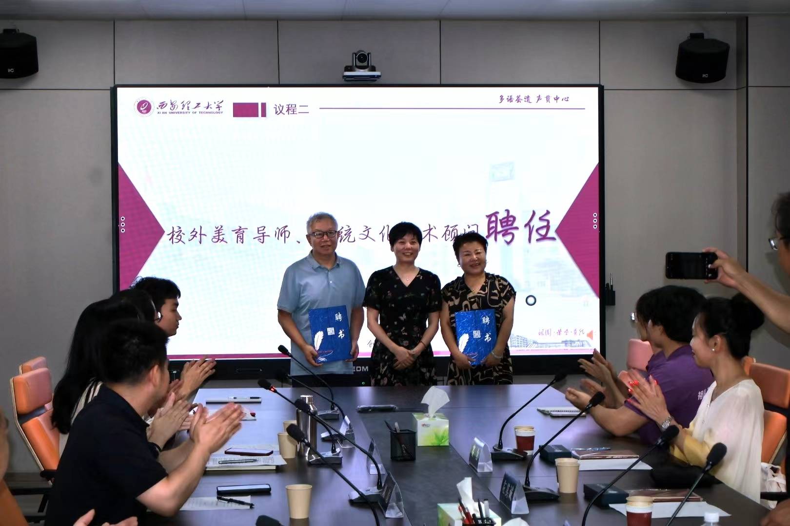 隨后,活動進入分批聘任環節。陜西省非物質文化遺產大師及傳承人張雙敏、楊帆、左其誠、趙琳靜以及西安易思創文化傳播有限公司總經理賽力被正式聘任為國際工學院的校外美育導師和傳統文化藝術顧問。他們的加入,將為學院推動五育并舉注入新活力,也為“非遺煥新”社會實踐隊深入研究非物質文化遺產的跨文化傳播提供了有力的指導。