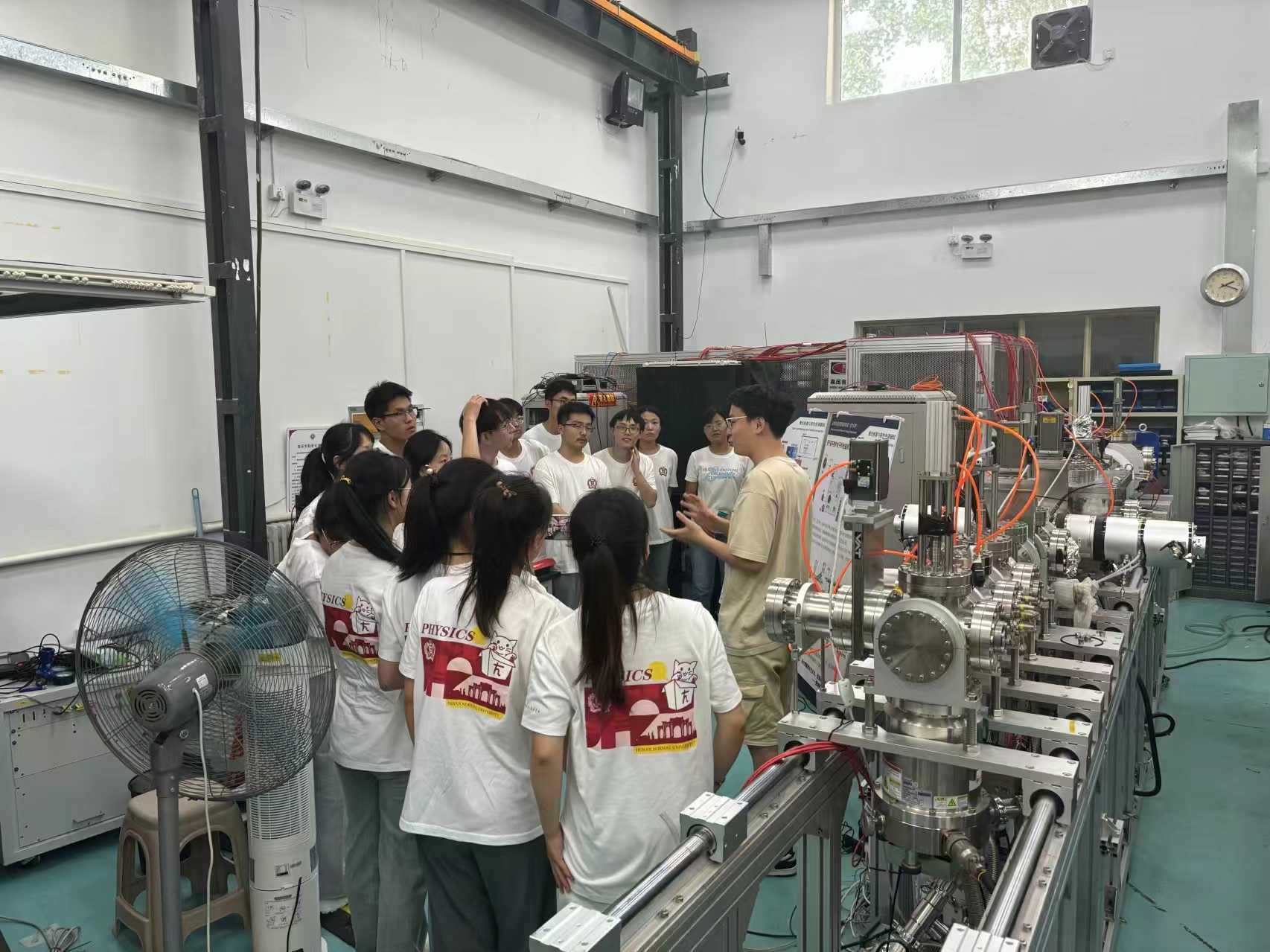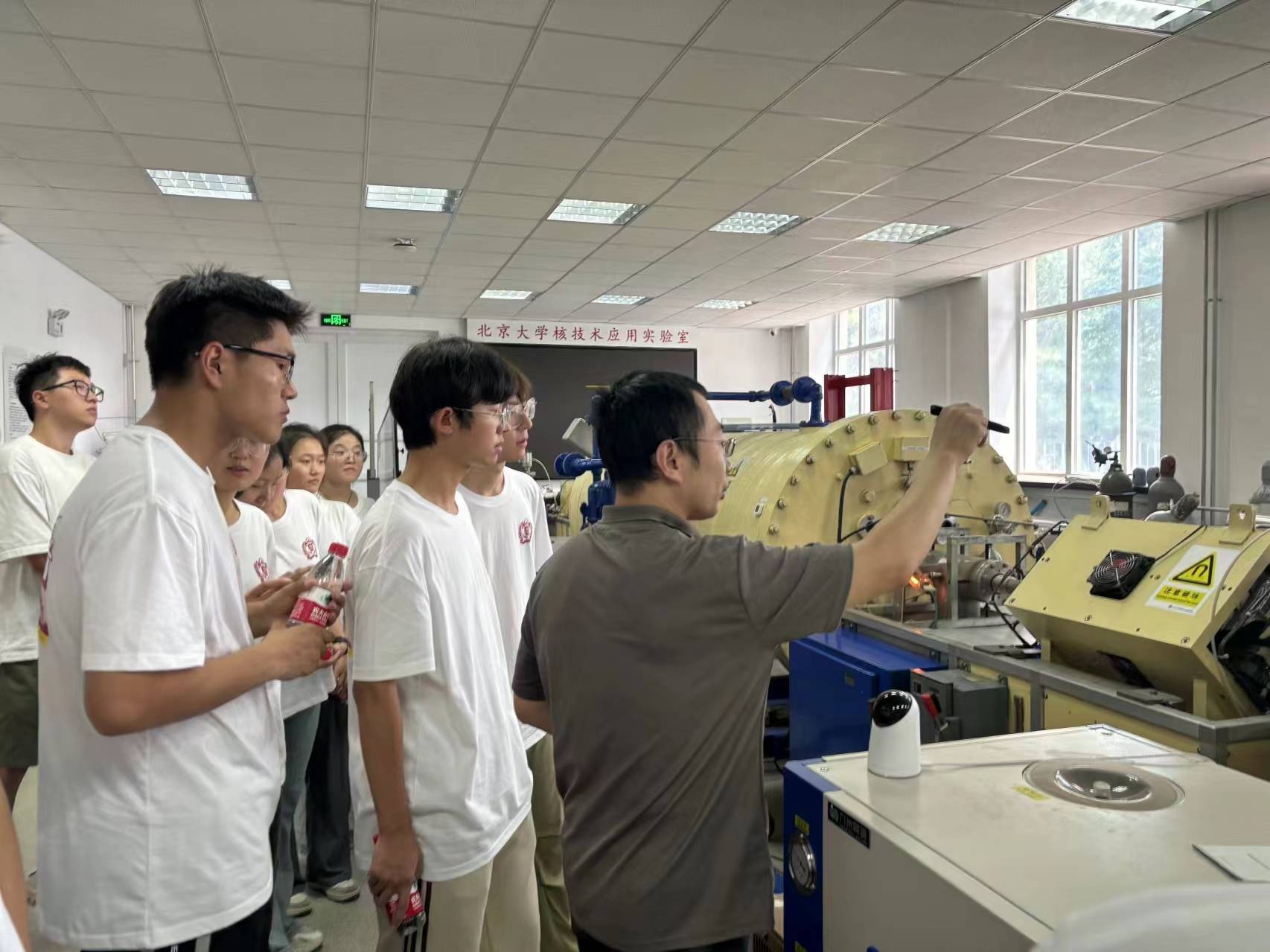 調研團首先來到北大核物理與核技術國家重點實驗室,徐川老師向大家簡單介紹了2×1.7MV串列大型靜電加速器構造及基本原理,明白離子注入/輻照實驗和盧瑟福背散射和溝道分析等離子束分析工作在選擇抗輻射新型材料的重要作用。在講解過程中大家積極與老師進行交流探討,激發了同學們對核物理領域的濃厚興趣。