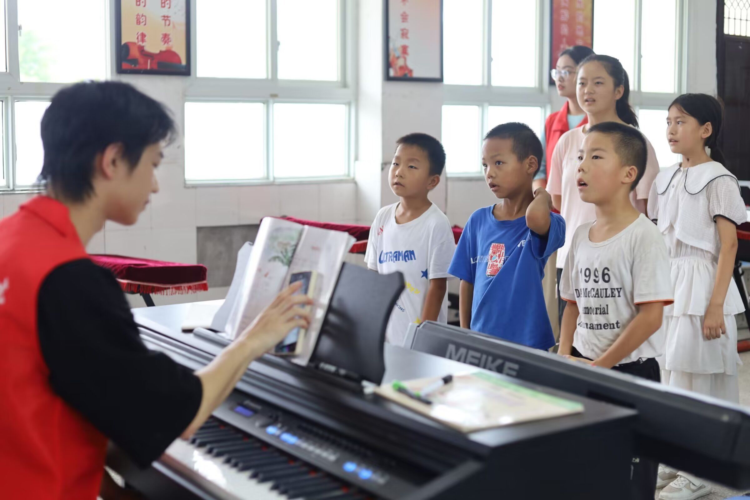 圖為志愿者教學小朋友們學習樂曲時的照片。多彩大學生網 隆瑩瑩 供圖