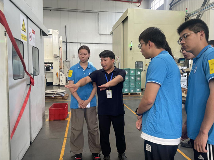 通過這次參觀調研,隊員們認識到阿雷蒙公司在沖壓件制造方面表現出色,其卓越的技術和嚴格的質量控制樹立了行業標桿。在與車間主任的交談中隊員們得知,公司引進了最先進的沖壓設備和工藝,采用高精度的模具設計和制造技術,確保每一件沖壓件都具備極高的精度。在生產車間參觀過程之后,隊員們對于公司不斷的技術創新與工藝改進和在沖壓件的材料選擇、表面處理和加工工藝上的深入研究有了新的感悟。