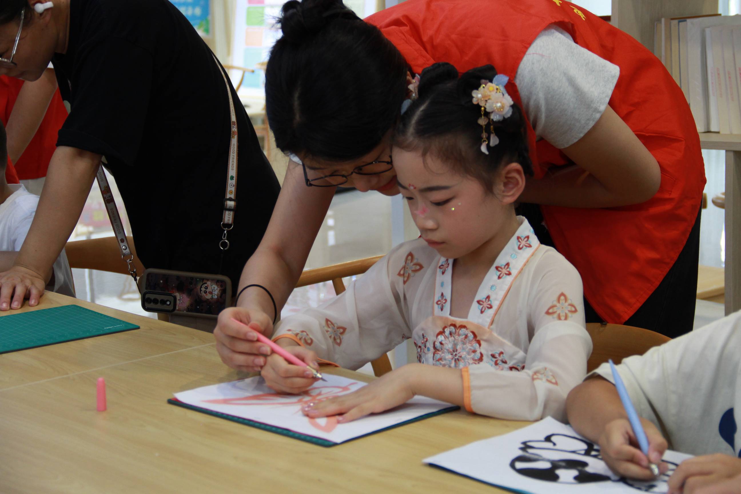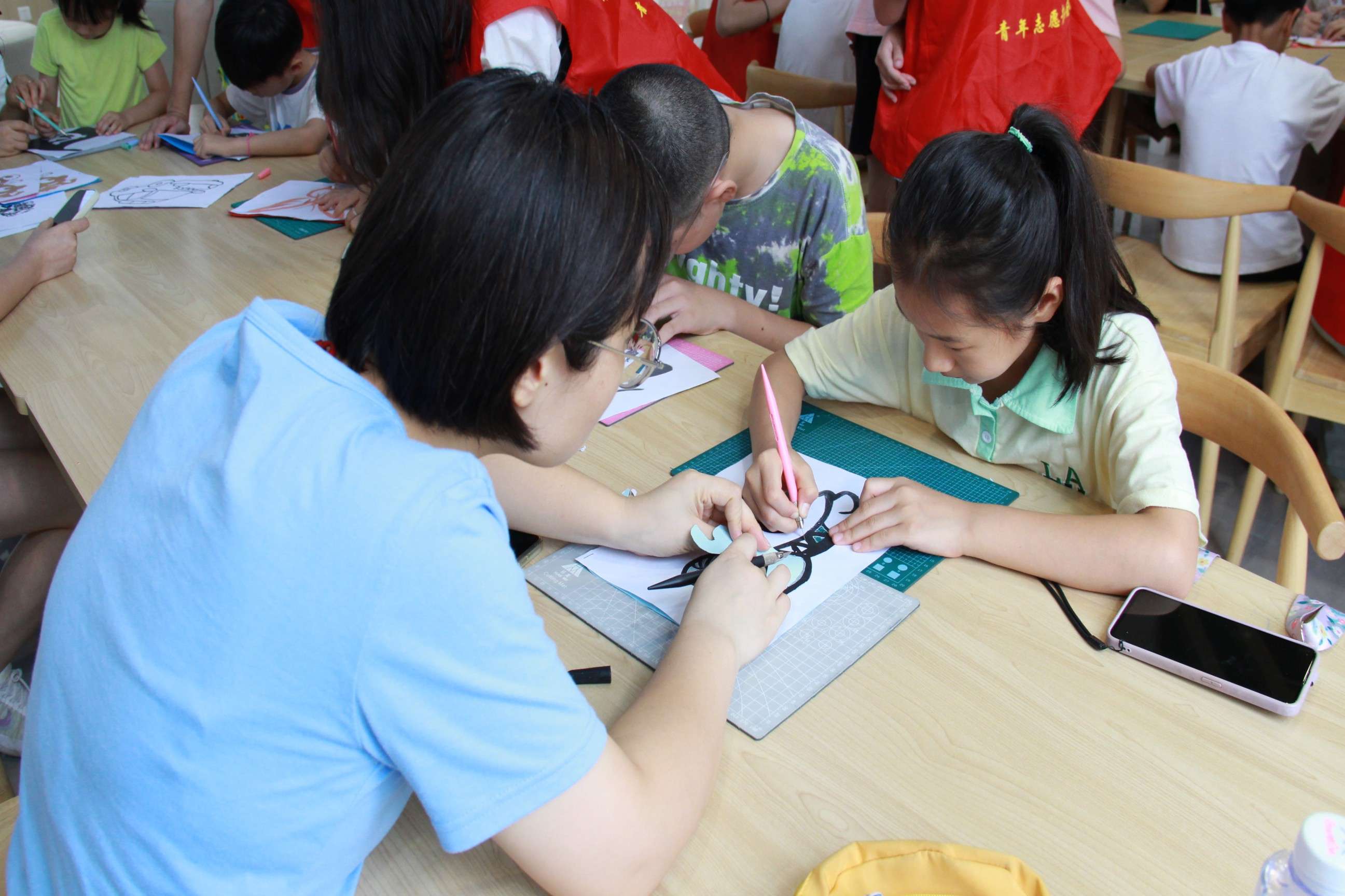 圖為新龍湖社區活動,社區負責人陳老師輔助小朋友完成刻紙作品。多彩大學生網通訊員江雨震 攝