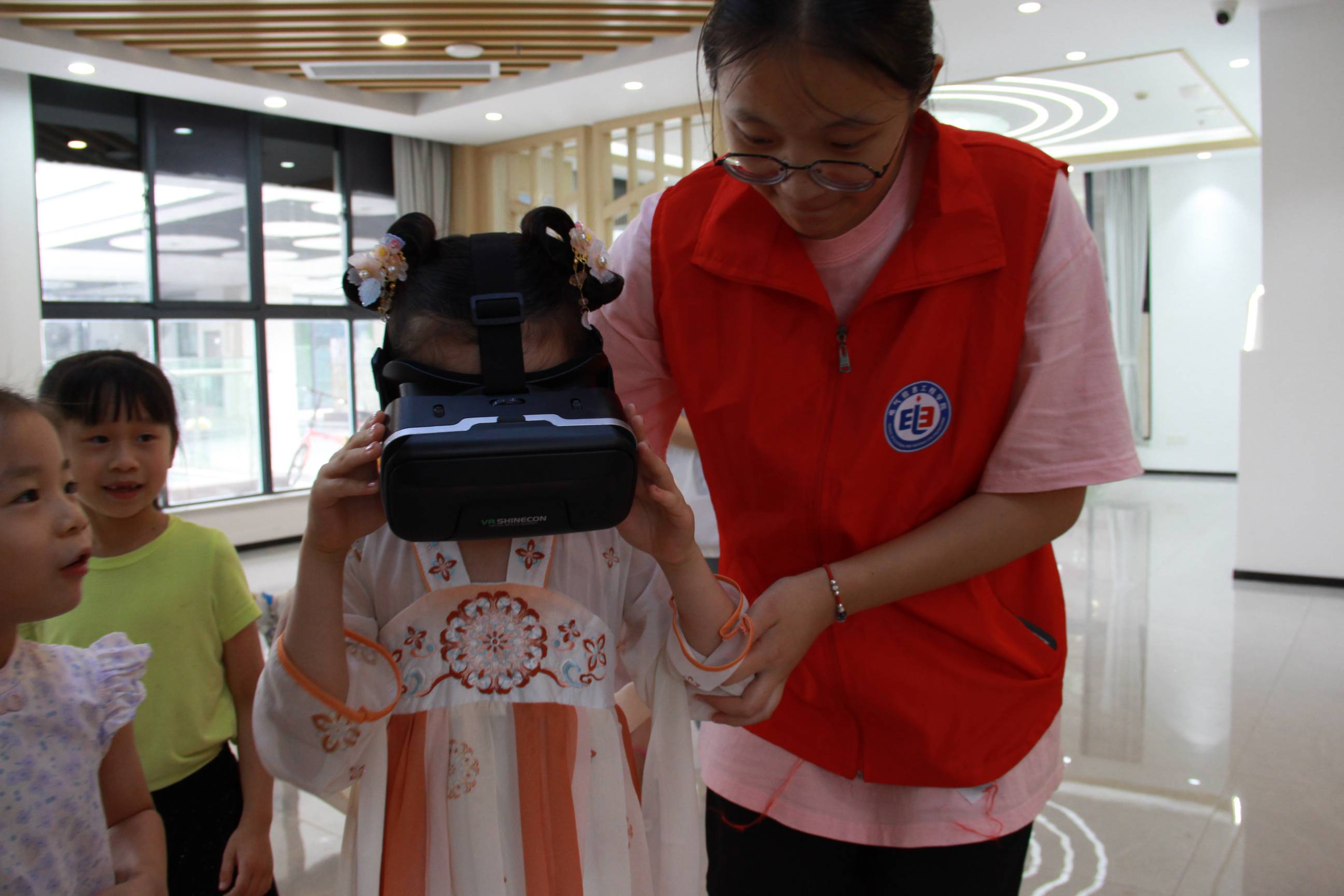 圖為新龍湖社區活動,團隊成員滕建英帶小朋友們體驗VR展館。多彩大學生網通訊員江雨震 攝