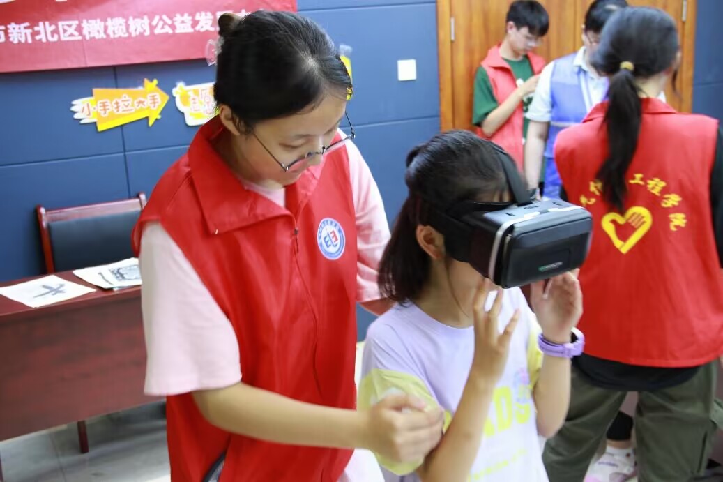 圖為團隊成員帶小朋友體驗VR眼鏡,觀看云端刻紙課堂。團隊成員江雨震 攝