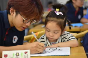 圖為團(tuán)隊(duì)成員指導(dǎo)小朋友制作刻紙作品 團(tuán)隊(duì)成員蘇家豪 攝