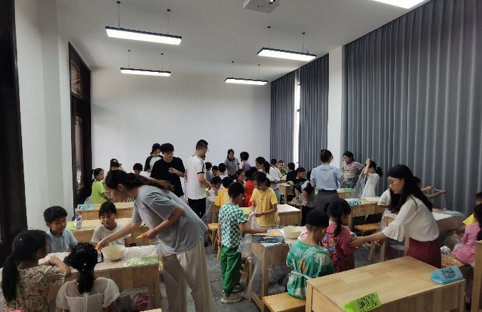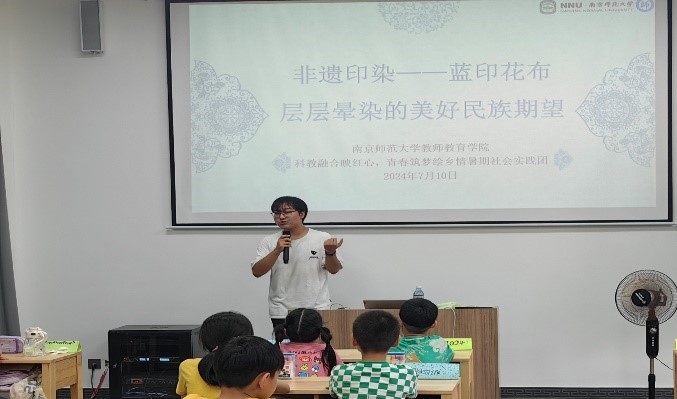 為點亮孩子的心靈之窗,深刻體會中華傳統(tǒng)文化的深邃與迷人,7月10日,桐鄉(xiāng)市經(jīng)濟(jì)開發(fā)區(qū)(高橋街道)漕涇村攜手南京師范大學(xué)教師教育學(xué)院“科教融合映紅心,青春筑夢繪鄉(xiāng)情”暑期實踐團(tuán)隊的小老師們,為孩子們帶來了一堂獨特的非遺印染體驗課“非遺印染——藍(lán)印花布,層層暈染的美好民族期望”,帶領(lǐng)孩子們共同探索桐鄉(xiāng)特色的非物質(zhì)文化遺產(chǎn)——藍(lán)印花布的制作工藝和深刻內(nèi)涵。簡單的藍(lán)白兩色,創(chuàng)造出了一個淳樸自然、千變?nèi)f化、多姿多彩的藝術(shù)世界。藍(lán)印花布的樸素與典雅,沒有歷史的厚重,卻無處不散發(fā)著中華文化的淡雅高潔。在這場旅程中,孩子們了解了藍(lán)印花布的發(fā)展歷史、認(rèn)識了紋樣的特色內(nèi)涵,并親身體驗了藍(lán)印花布的古法印染技藝,深刻體悟了這一傳統(tǒng)藝術(shù)的博大精深與無限魅力。