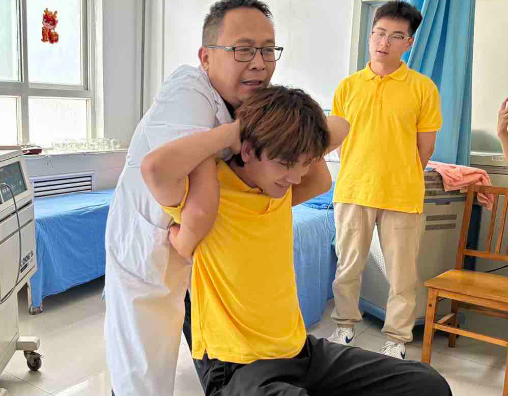 (圖為指導(dǎo)醫(yī)生為志愿者演示腰部酸軟拉伸手法)