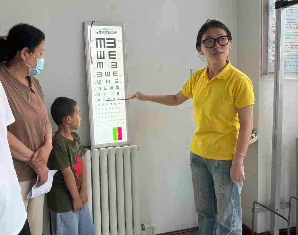 (圖為志愿者輔助醫(yī)生對居民進(jìn)行視力檢測)