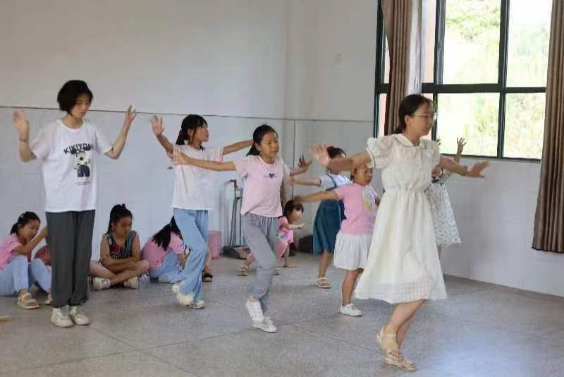 圖為小朋友們在跟著志愿者們練習(xí)舞蹈時(shí)的張開雙手的動作。多彩大學(xué)生網(wǎng) 隆瑩瑩 供圖