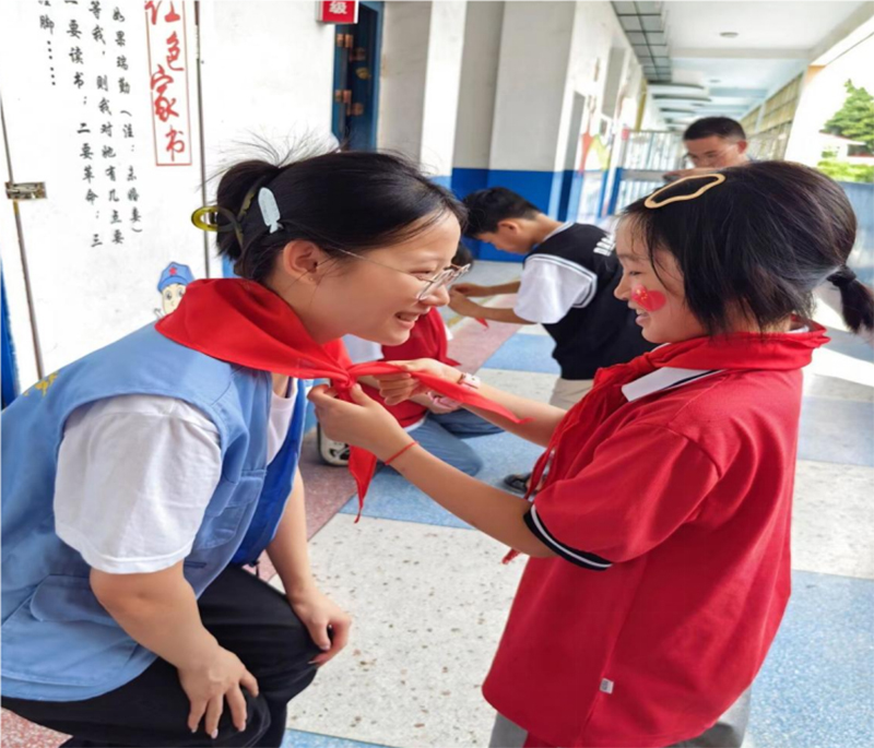 圖為小朋友為志愿者系上紅領(lǐng)巾