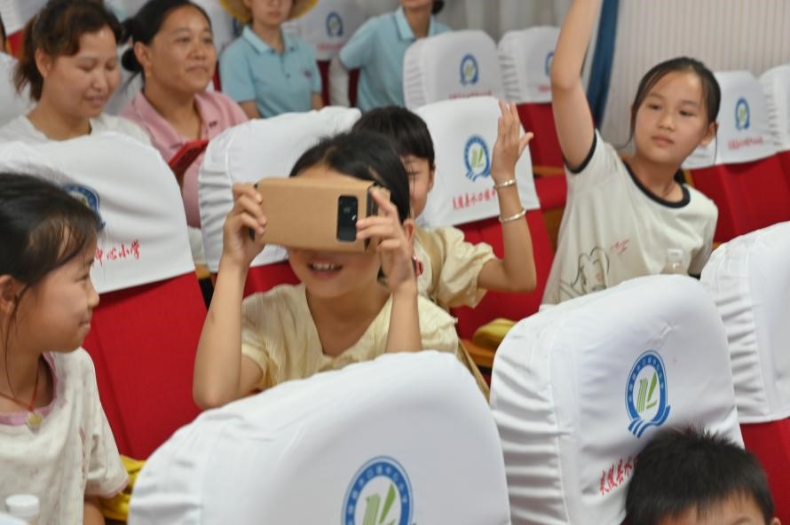 在家長見面會上,主持人向大家介紹了“青年燎原”實踐隊七彩課堂教師和課程設置等內容。10位課堂小老師各自做了極具特色的自我介紹,向大家展示了歌曲、舞蹈、英文演講等特長。其中由科學老師帶來的自制VR眼鏡瞬間點燃了見面會的氣氛,小朋友們踴躍舉手試戴,現場十分熱鬧。
