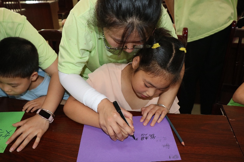 圖為實踐隊員協助留守兒童書寫內心的話語。 藍添宜 供圖