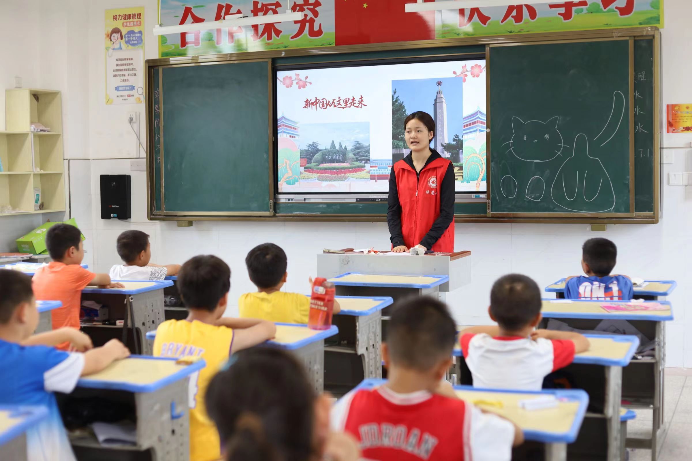 圖為可可夢志愿服務隊隊員在為學生們講述西柏坡精神。多彩大學生網通訊員 隆瑩瑩 供圖