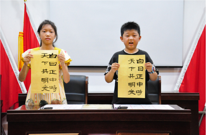 隨后,同學們分組表演,各展才華。在紅色情景劇《燈》中,同學們跟隨毛主席等偉大領袖的腳步,再現了實事求是的真理之光;在“墨香書中華”中,兩位同學以雄健的筆力,肆意揮毫潑墨,寫下了“白日正中時,天下共明光”的書法佳作;在模擬法庭中,同學們“各司其職”,以嚴肅的態度和嚴謹的作風再現了人民法庭的公正與威嚴;在配音表演中,同學們惟妙惟肖地為《那兔》動畫中的角色配音,生動有趣地重現了“四渡赤水”的壯舉。